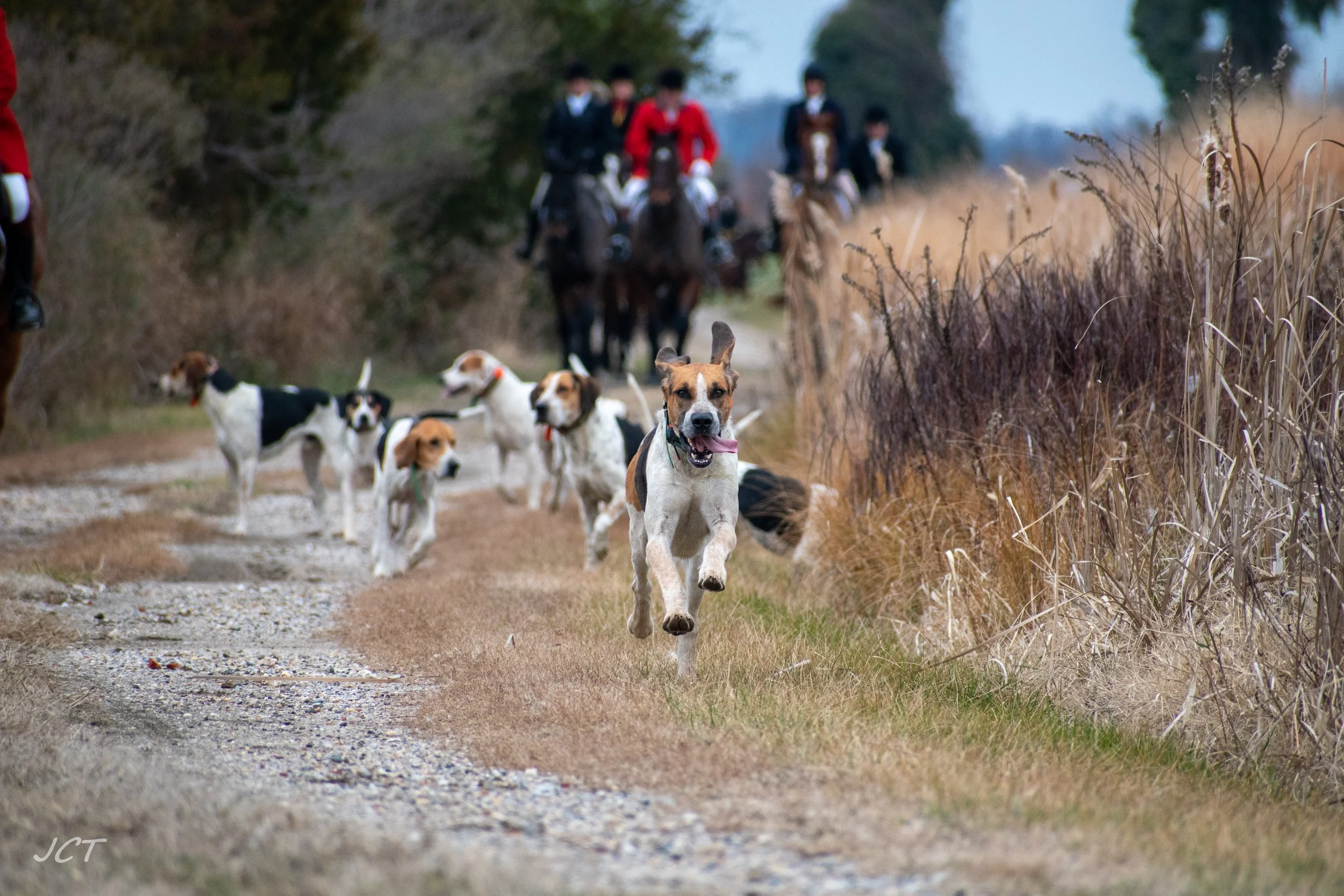Do not speak to hounds. That is for staff alone. Don’t interfere with hounds unless asked to by staff. If a hound is trying to get forward up through a moving field, keep moving but give him what room you can, and cock your horse’s head enough so that the horse can see the hound and not be surprised. Notify other riders of hounds’ presence on a trail with “Ware hound right/left.”